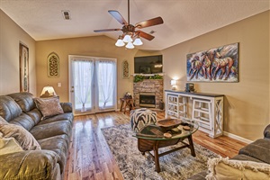 The cottage is single-level, raised on stilts with covered parking underneath — great for motorcycles, trailers, and keeping your vehicles dry. Inside, the living area has a comfortable living room with a gas fireplace, flat-screen TV, and a sofa sleeper for extra flexibility. The kitchen is fully equipped with a combo K-Cup and drip coffee maker, dining table with seating for six, and everything you need to cook a full meal. The King suite has an en-suite bathroom, and the Queen bedroom has its own deck access and shares a second full bathroom with the hallway. Both bedrooms have DirecTV and a full-size washer and dryer is in the unit for longer stays.
